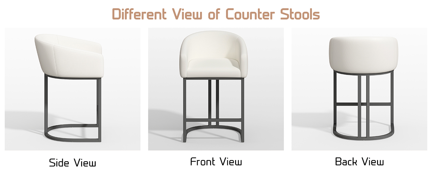 Sleek 26″ counter-height bar stools (set of 2) with modern barrel design in grey/white, linen-upholstered backs, sturdy 350-lb metal frame, non-slip pads, and easy assembly for versatile kitchen, bar, or lounge use.