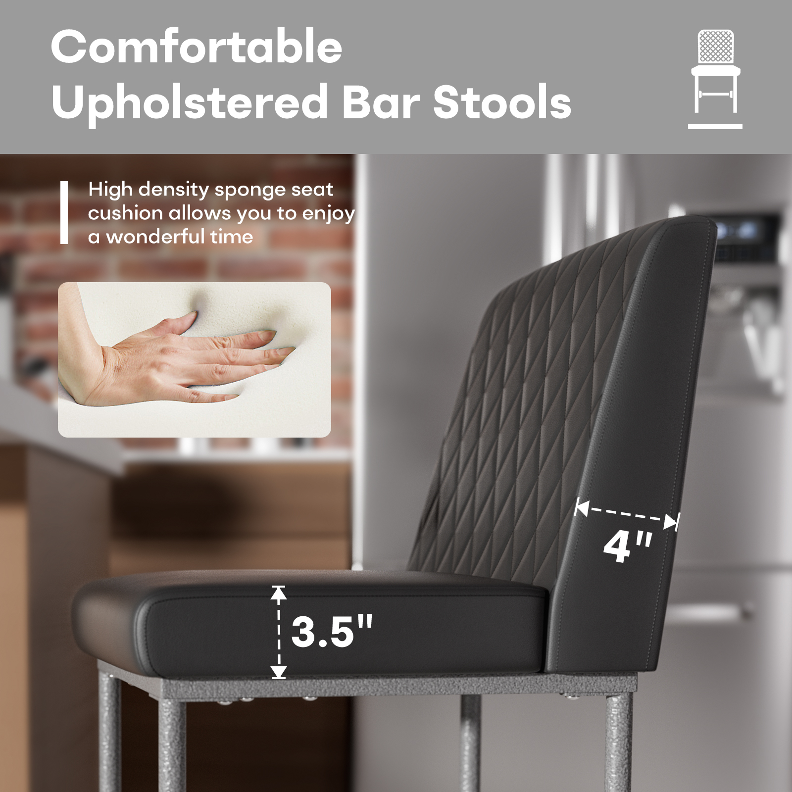 - Thick Cushioned Leather Seats:The faux leather seats are padded with 3.5-inch thick cushions for lasting comfort. Perfect for daily meals or casual gatherings, these leather bar stools provide cozy seating all day long.