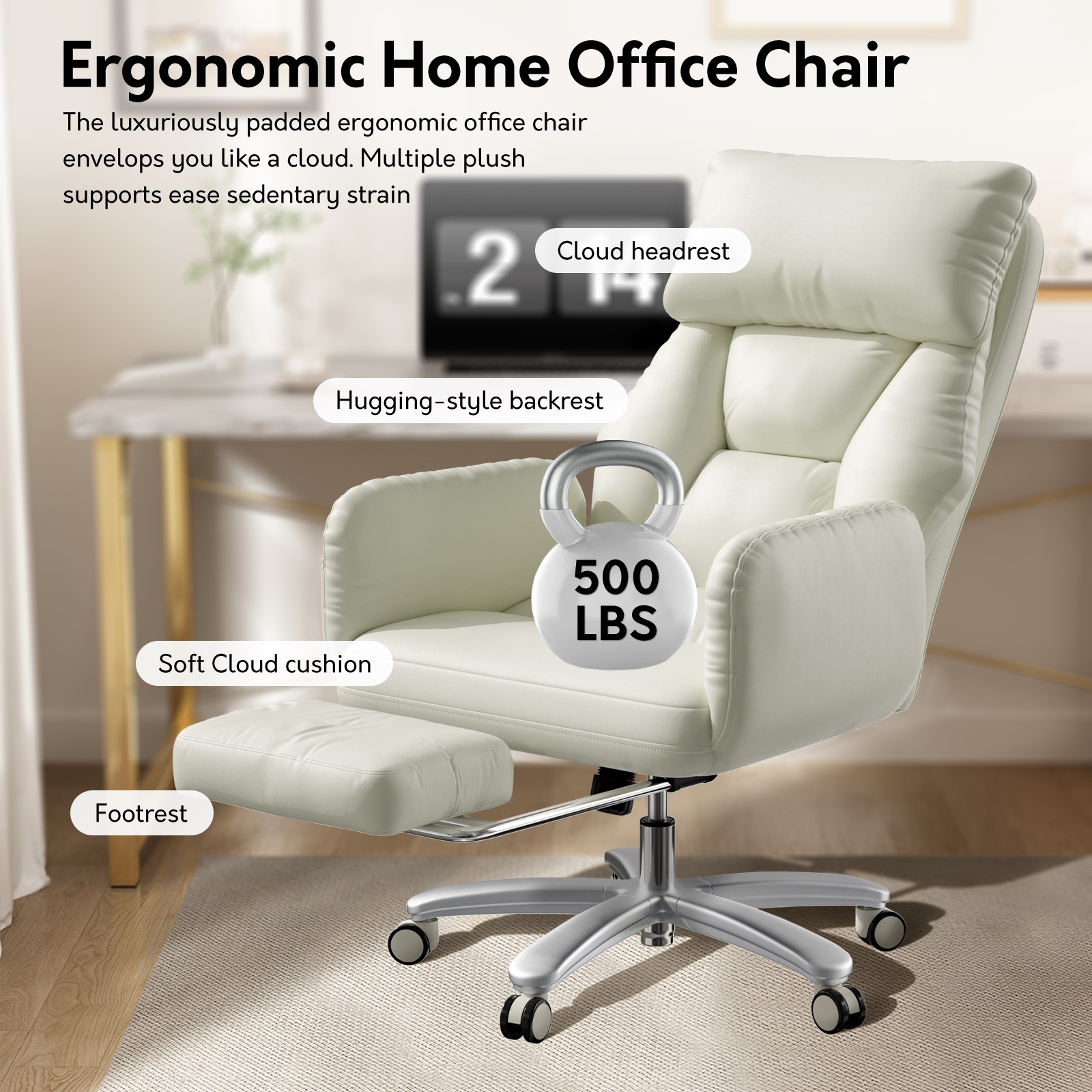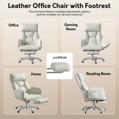 - Luxurious Recline:This executive office chair is equipped with a hugging-style backrest that reclines from 90° to 120°, a cloud-like headrest, and a retractable footrest, all wrapped in easy-to-clean, durable leather — creating a premium ergonomic experience.
