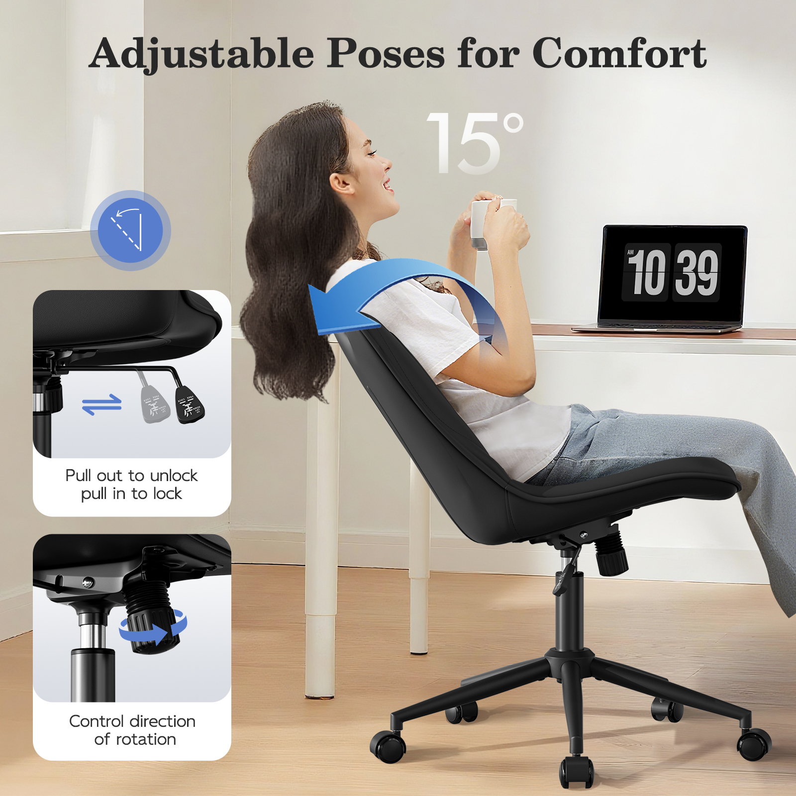- Adjustable Height & Tilt:Seat height adjusts from 21.6″ to 37.4″ overall; 15° recline with lock/unlock function for personalized comfort.