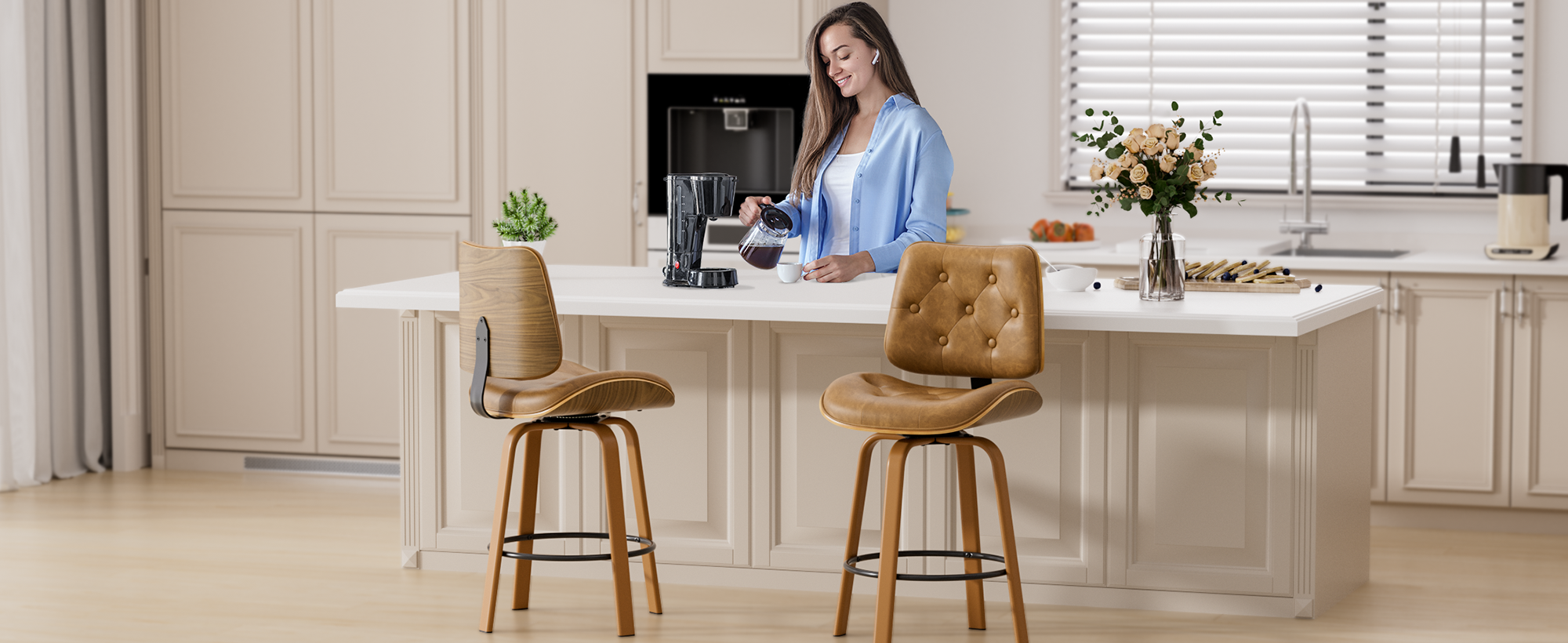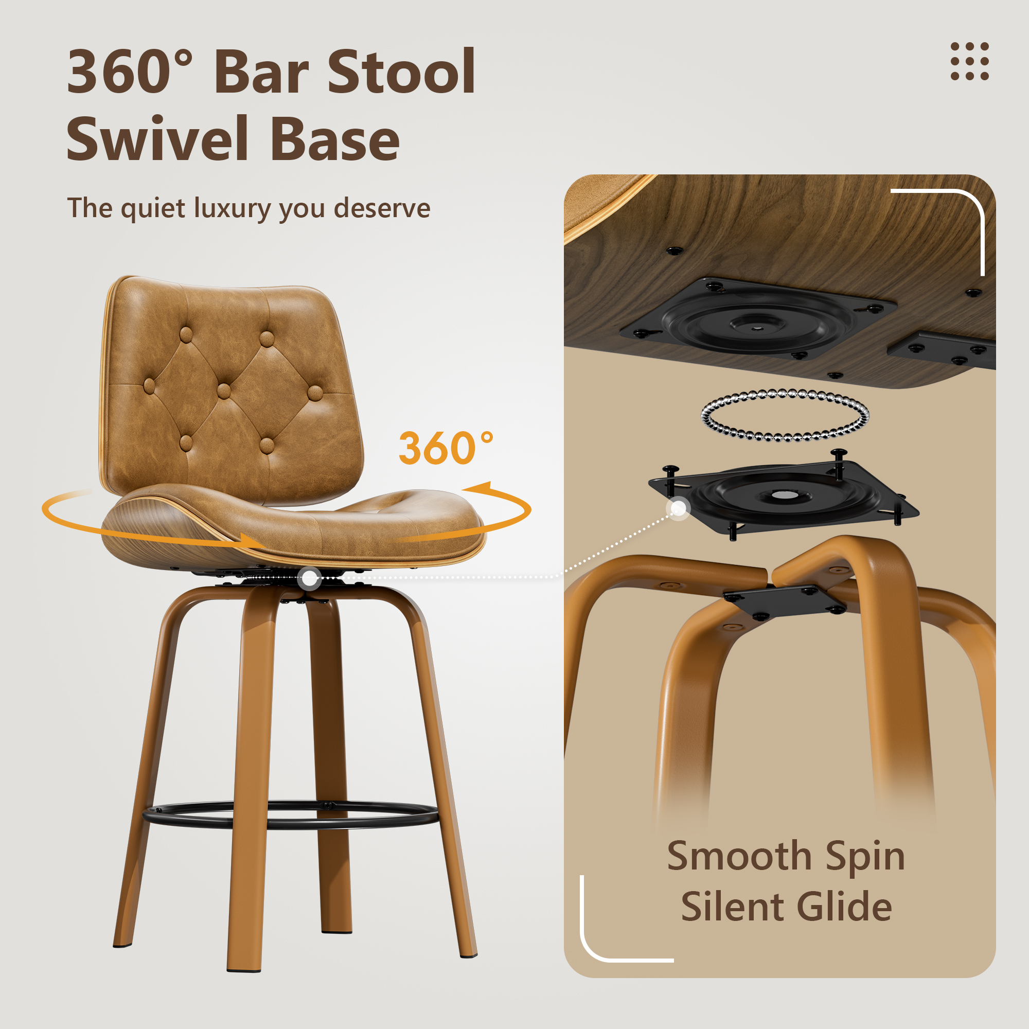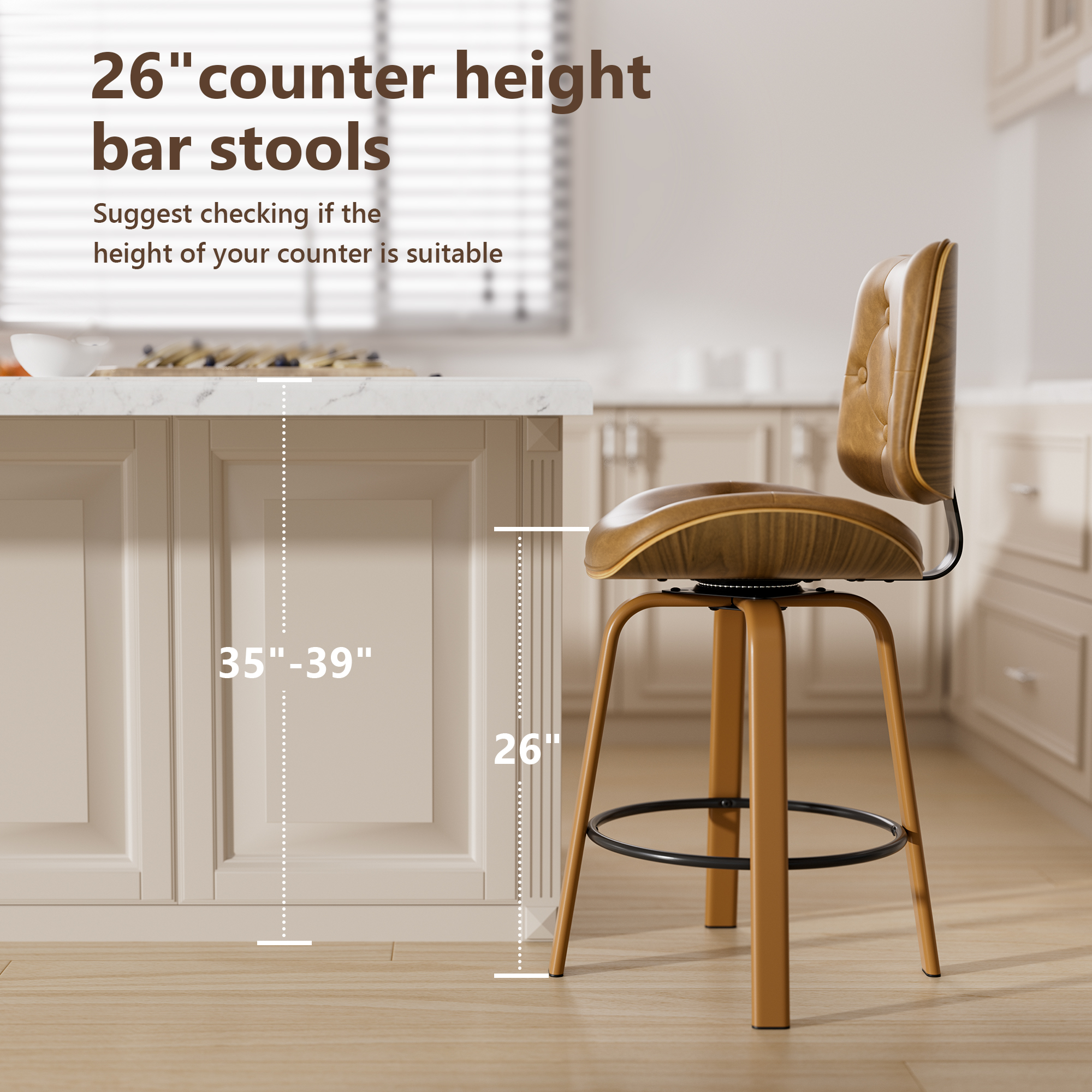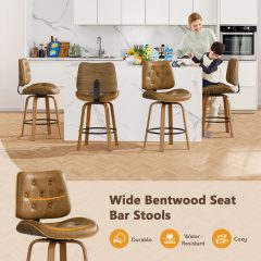 Upgrade your kitchen or home bar with this Counter Height Bar Stools Set of 2, designed with a refined blend of comfort, function, and mid-century style. These 26 inch swivel bar chairs feature a beautifully curved bentwood backrest that provides natural ergonomic support while adding a warm, modern touch to any space.