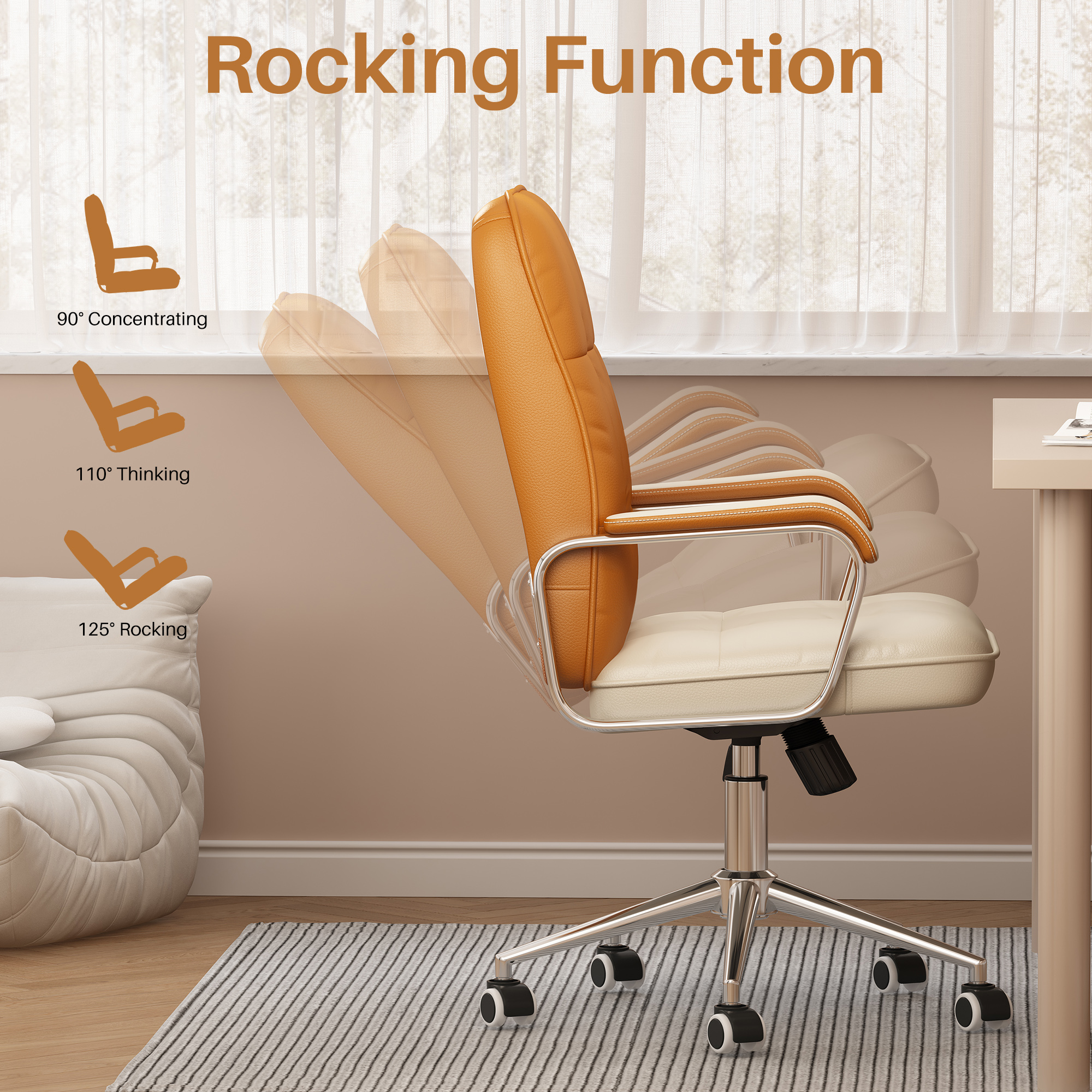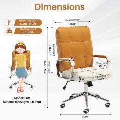 This executive office chair combines mid-century modern style with an ergonomic design, making it a perfect addition to any workspace. Crafted with PU leather, a sturdy metal frame, and padded foam with pocket springs, it ensures optimal comfort and support. The chair features a 300 lb weight capacity and 360° silent, smooth swivel for flexibility in any position. Its adjustable backrest can recline from 90° to 120°, with linkage and padded armrests enhancing relaxation. The seat height can be adjusted by 3.93 inches, while the BIFMA and SGS certified 3-stage lifting cylinder ensures durability. The 360° quiet-rolling casters allow seamless mobility, making it a reliable and comfortable computer chair. Ideal as an ergonomic office chair or a reclining desk chair, it also serves as a big and tall office chair for various needs. Overall dimensions: 24.8”(D) x 24.8”(W) x 39.37”~43.3”(H), with a seat size of 20.47”(L) x 19.7”(W).