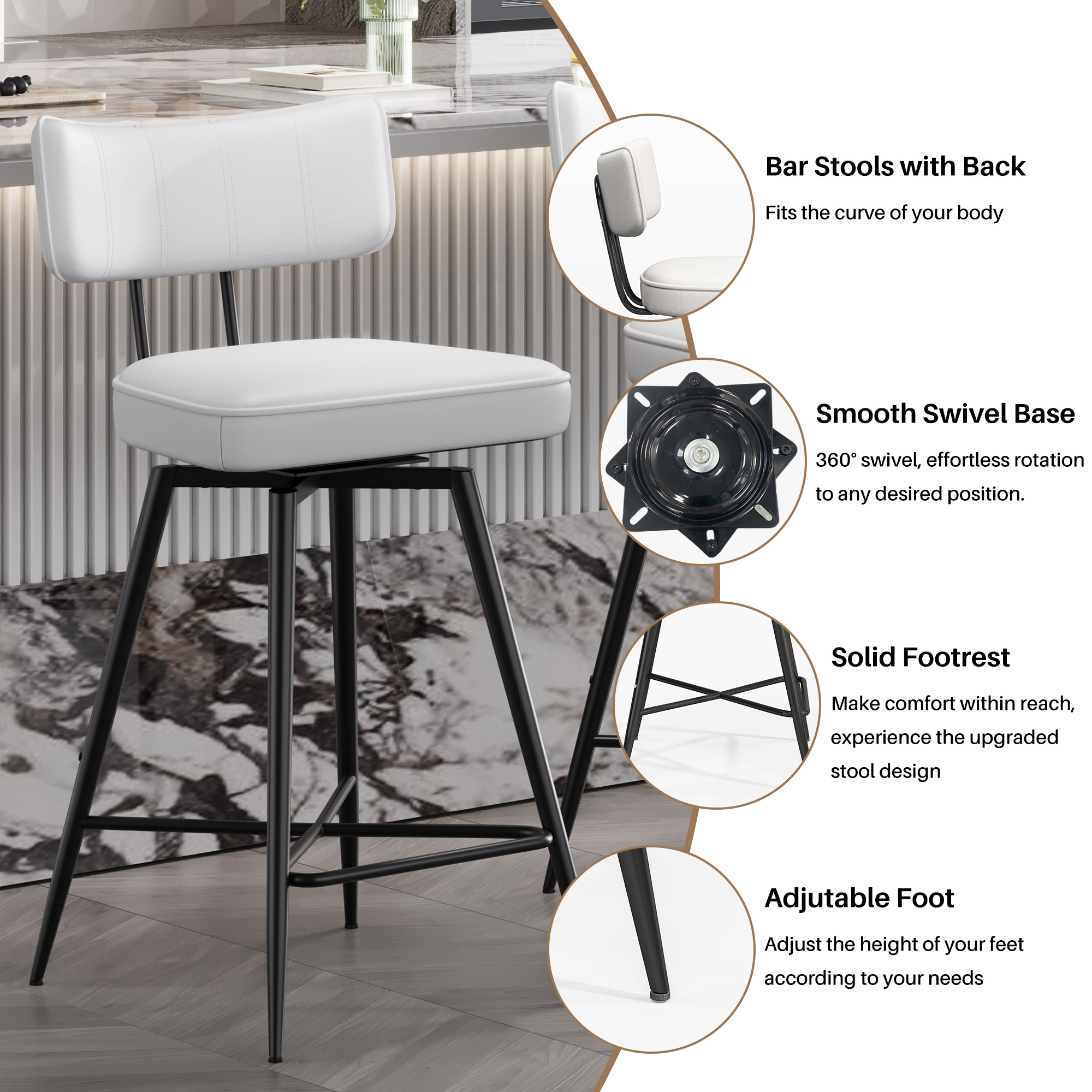 - Rust-Resistant Metal Structure: This bar stools features a sturdy metal base and deformation-resistant design, ensuring durability, rust resistance and the ability to withstand weights of up to 300 pounds. The smooth black finish complements the white faux leather, creating a stylish appearance. Additionally, the feet are equipped with adjustable protective footpads to adjust the height slightly, protecting the floor and ensuring stability even on uneven surfaces.
