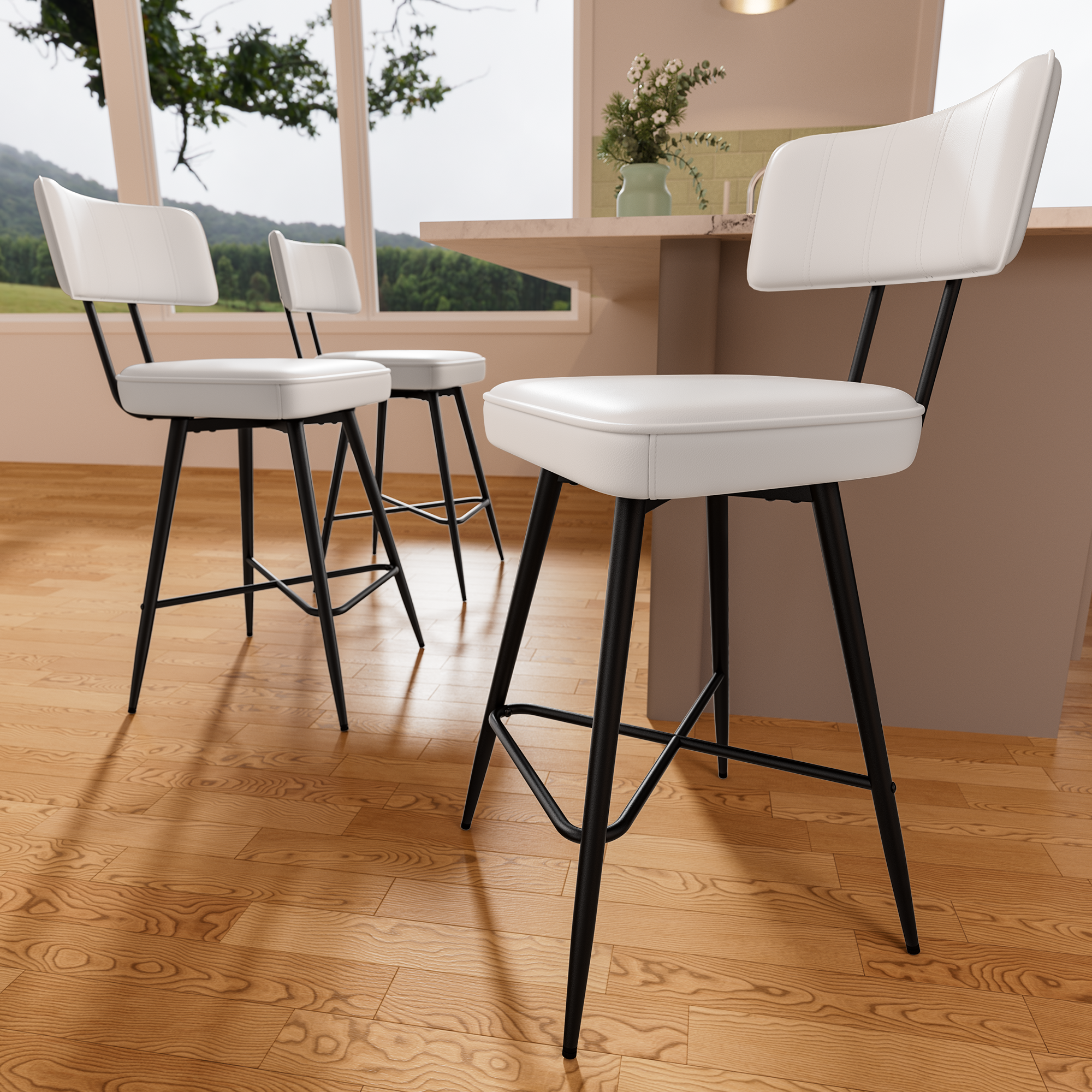 - Ninecer Swivel Bar Stools Set of 3, 26″ Counter Height Bar Stools with Back, Leather Upholstered Kitchen Barstool with Footrest and Metal Frame, Bar Chair for Kitchen Island, White