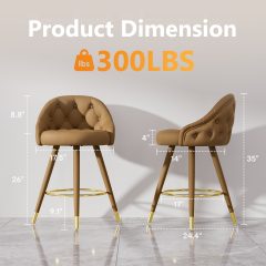 Add elegance and comfort to your kitchen or dining space with this set of 2 26 inch counter height swivel bar stools. Designed with a plush velvet upholstered seat, a stylish tufted low backrest, and a thick 4-inch cushion, these modern bar chairs provide a cozy seating experience for casual meals or gatherings.